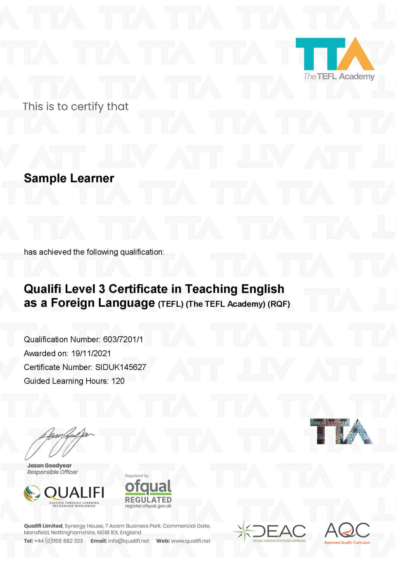 A regulated Level 3 qualification means that Ofqual (UK government) has approved the qualification to be at a recognised level of achievement. The Level 3 TEFL Certificate is the same level as the following qualifications: A-Level, BTEC Nationals, International Baccalaureate I8 and Advanced Apprenticeships.